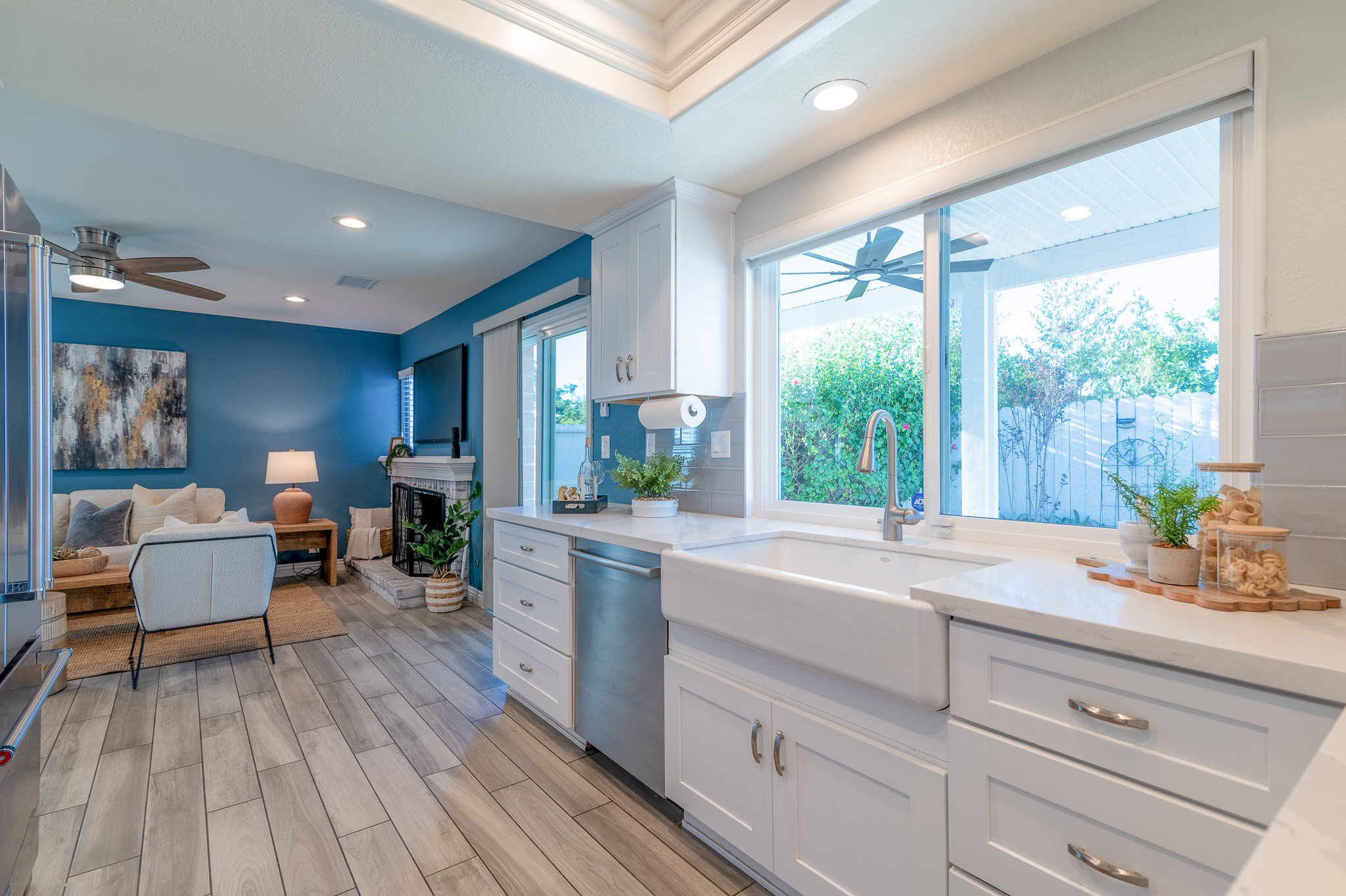 Stunning, upgraded two bedroom, single-story home in Casta del Sol with a view! Beautifully updated throughout, this home features attractive flooring and large baseboards, with a living room offering a brick fireplace, ceiling fan, recessed lighting, and scenic views. The dining area includes bar seating, elegant pendant lighting, and a beautiful countertop, opening to a remodeled kitchen with white mission-style cabinetry and stainless steel appliances, along with a beautiful view from the kitchen window. The primary bedroom features a ceiling fan, recessed lighting, plantation shutters, and a beautifully remodeled bathroom with mission-style cabinetry and an upgraded shower. The secondary bedroom includes plantation shutters and recessed lighting and the guest bathroom has also been tastefully upgraded. Enjoy outdoor living on the back patio with a patio cover, electric roller screen, and peaceful views. The property also has a private front entry and a prime single-loaded street location. Additional highlights include replaced windows and a sliding door, PEX repiping, AC and FAU, and an attached 1-car garage with direct access. Residents of Casta del Sol enjoy resort style amenities including a pool, spa, pickleball, tennis, bocce ball, lawn bowling, fitness center, library, gardens, and a variety of clubs and social activities.